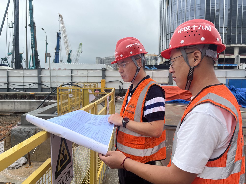 2024年4月26日,深圳市五一勞動獎章獲得者、中鐵十九局軌道公司項目副經理夏荔(左)在穗莞深城際鐵路前皇段皇崗口岸站建設現場忙碌。新華社發