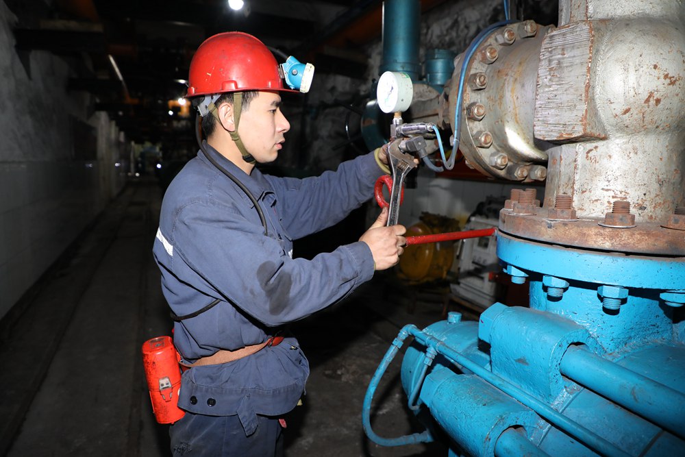 2024年4月30日,冀中能源峰峰集團新屯礦機電區副區長顧博在井下泵房檢修水泵。新華社發