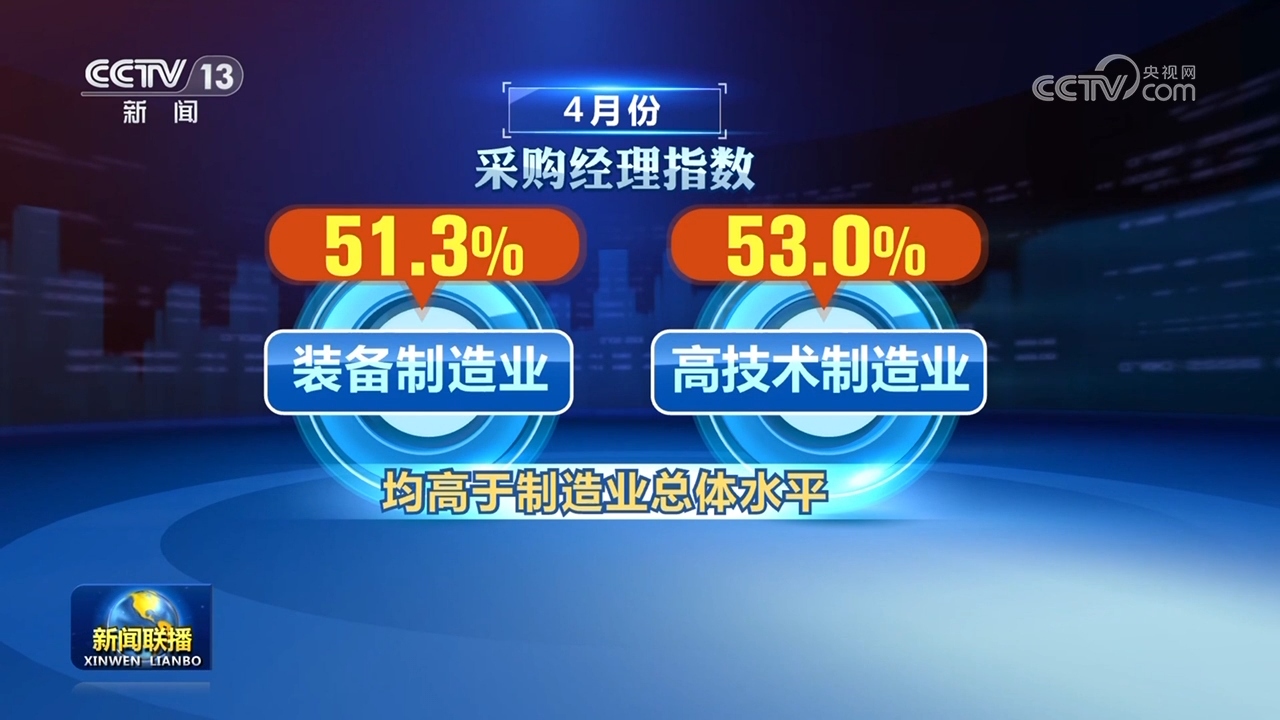 新動能繼續較快擴張。4月份裝備製造業(ye) 和高技術製造業(ye) 采購經理指數分別為(wei) 51.3%和53.0%,均高於(yu) 製造業(ye) 總體(ti) 水平。