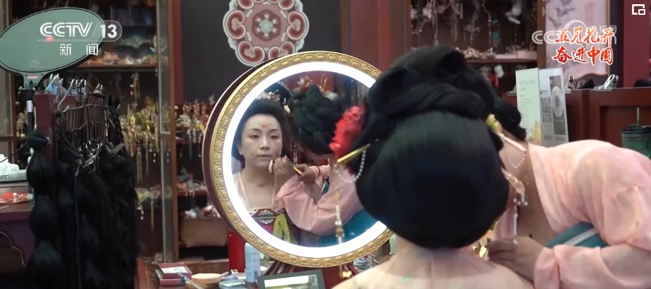 在陝西西安,有這樣一位年輕人,她仿佛擁有一種複刻舊時光的魔力。敷粉、畫眉、點唇,穿上漢服、戴上發飾,不到1個(ge) 小時,一個(ge) 現代的女孩就穿越回了漢唐。“00後”漢服妝造師胡芯銀,讓今人和古人在裝束上相逢。