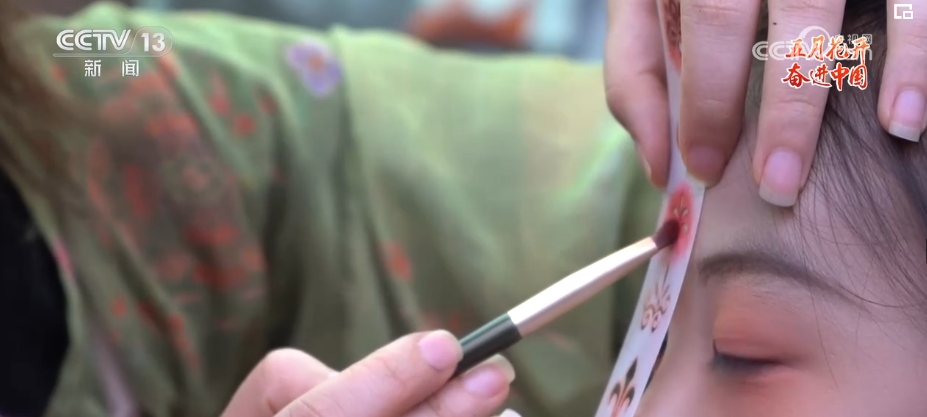 花鈿是古代女性在額頭部位點綴的一種花飾。現在的胡芯銀,不僅(jin) 會(hui) 根據顧客的年齡、臉型和服裝的樣式來搭配不同風格的花鈿,還會(hui) 給小姐姐們(men) 做一些傳(chuan) 統文化的講解。胡芯銀說,要想做得更好,就要多看多學。
