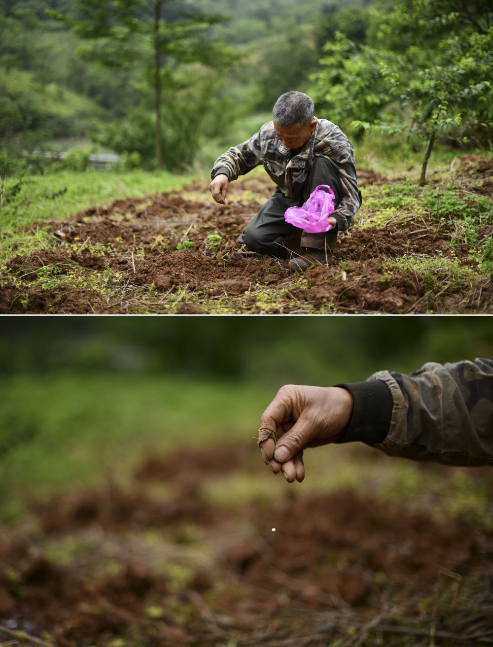 在廣西柳州市融安縣東(dong) 起鄉(xiang) 銅板屯,村民龍革雄在山上播種(4月23日攝)。10多年來,龍革雄返鄉(xiang) 創業(ye) ,和村民們(men) 一起發展水果種植和觀光旅遊。