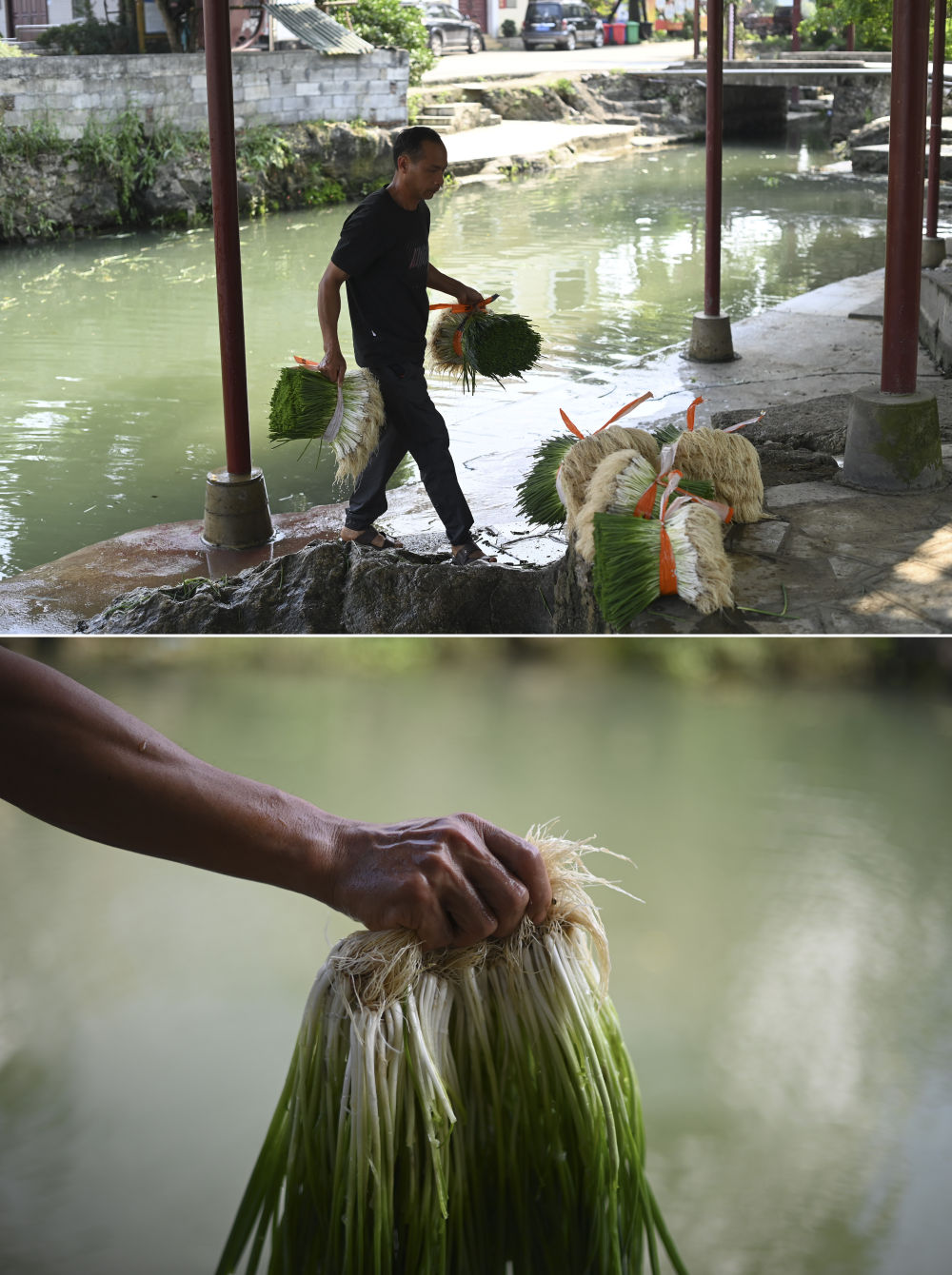 在廣西柳州市柳江區三都鎮覺山村,村民韋文中搬運香蔥,準備供應市場(4月16日攝)。香蔥種植產(chan) 業(ye) 是覺山村村民增收致富的支柱產(chan) 業(ye) ,韋文中種植10多畝(mu) 香蔥。