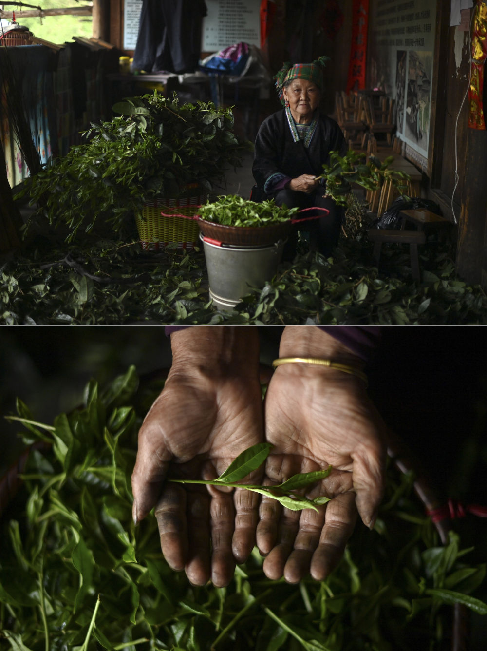 在廣西柳州市融水苗族自治縣杆洞鄉(xiang) 黨(dang) 鳩村,72歲的梁妹花老人在整理剛剛采摘的茶葉(4月11日攝)。油茶是當地的傳(chuan) 統飲品,梁妹花每天都要打油茶。