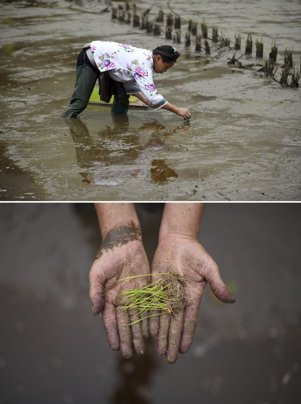 在廣西柳州市融水苗族自治縣杆洞鄉(xiang) 黨(dang) 鳩村,51歲的村民韋妹麗(li) 在插秧(4月11日攝)。韋妹麗(li) 家的兩(liang) 畝(mu) 多田,養(yang) 育她一家5口。