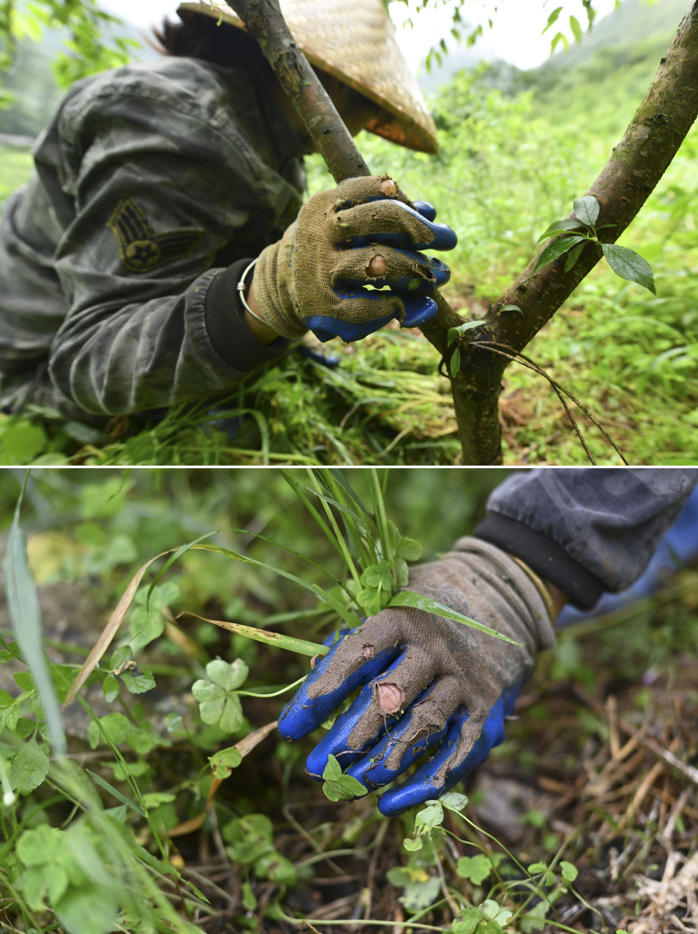 在廣西柳州市融安縣東(dong) 起鄉(xiang) 銅板屯,村民羅桂枝在山上給果樹除草(4月23日攝)。10多年來,羅桂枝和丈夫返鄉(xiang) 創業(ye) ,和村民們(men) 一起發展水果種植和觀光旅遊。