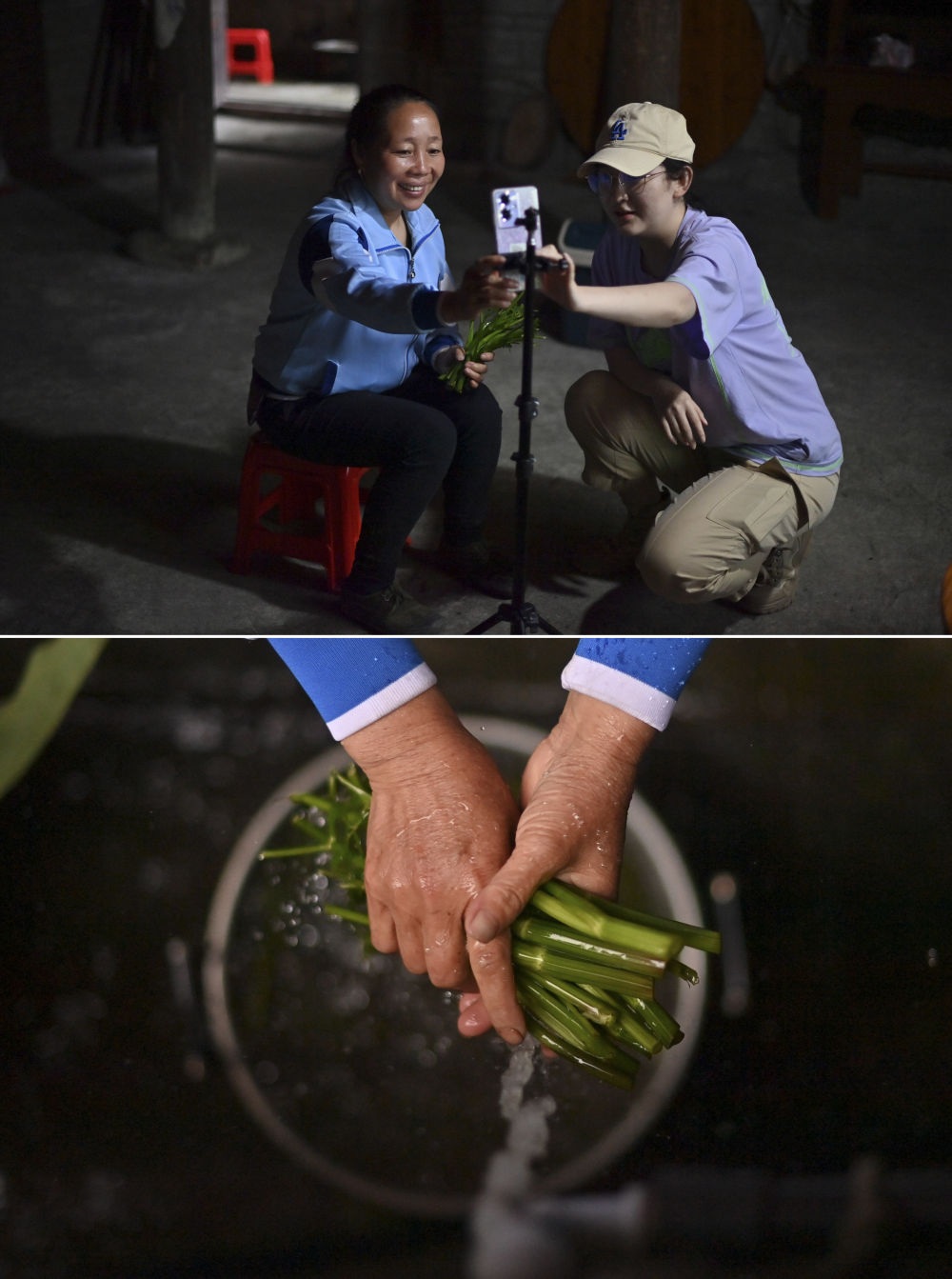 上圖:在廣西柳州市融水苗族自治縣杆洞鄉(xiang) 烏(wu) 英苗寨,48歲的梁足英(左)向大學生學習(xi) 直播帶貨;下圖:梁足英在洗野菜,準備銷往縣城(4月30日攝)。近年來,她積極參加夜校學習(xi) ,並通過網絡直播銷售當地蔬菜。