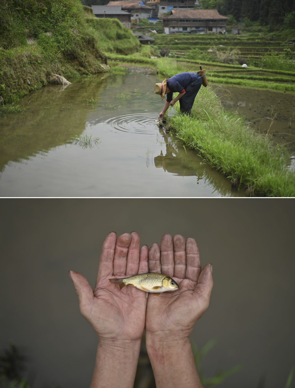 在廣西柳州市融水苗族自治縣杆洞鄉(xiang) 黨(dang) 鳩村,67歲的吳慶輝在稻田裏放魚苗(4月11日攝)。在稻田裏養(yang) 殖禾花魚是當地的傳(chuan) 統,可以提高稻田利用率,增加收入。