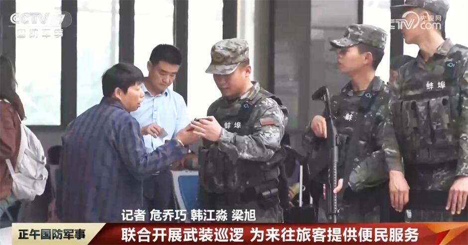 在安徽蚌埠火車站,武警官兵與(yu) 公安特警聯合開展武裝巡邏,主動加大對重點區域的實時監控和巡邏力度,在維護秩序的同時,官兵還耐心為(wei) 廣大旅客答疑解惑,提供便民服務。