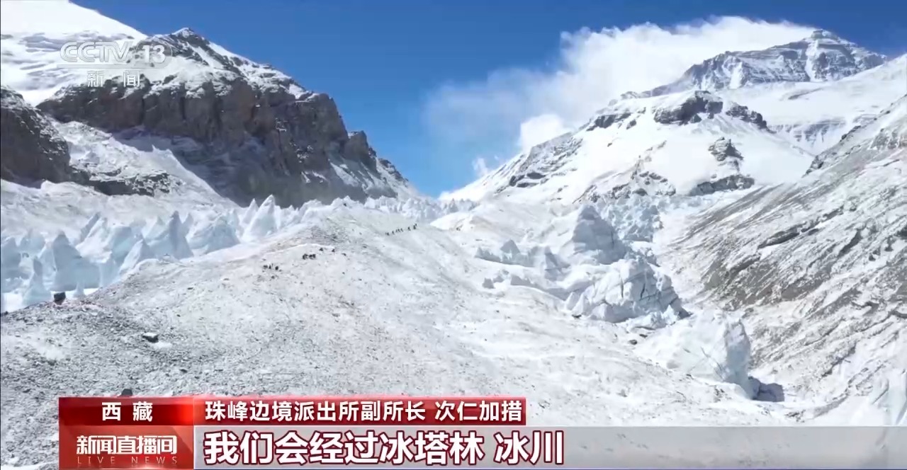 珠峰邊境派出所副所長 次仁加措:往裏走的話我們(men) 會(hui) 經過冰塔林、冰川,穿越碎石灘,整個(ge) 路途我們(men) 會(hui) 花費8到12個(ge) 小時,途中經過老大本營,那個(ge) 地方是最危險的路段。