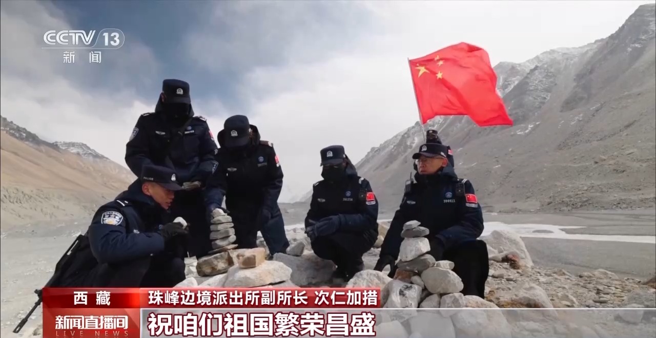 珠峰邊境派出所副所長 次仁加措:我們(men) 每次到這個(ge) 地方,有一個(ge) 儀(yi) 式,就是把石頭壘在這裏,表達我們(men) 的祝福。祝祖國繁榮昌盛,也祝我們(men) 心想事成。