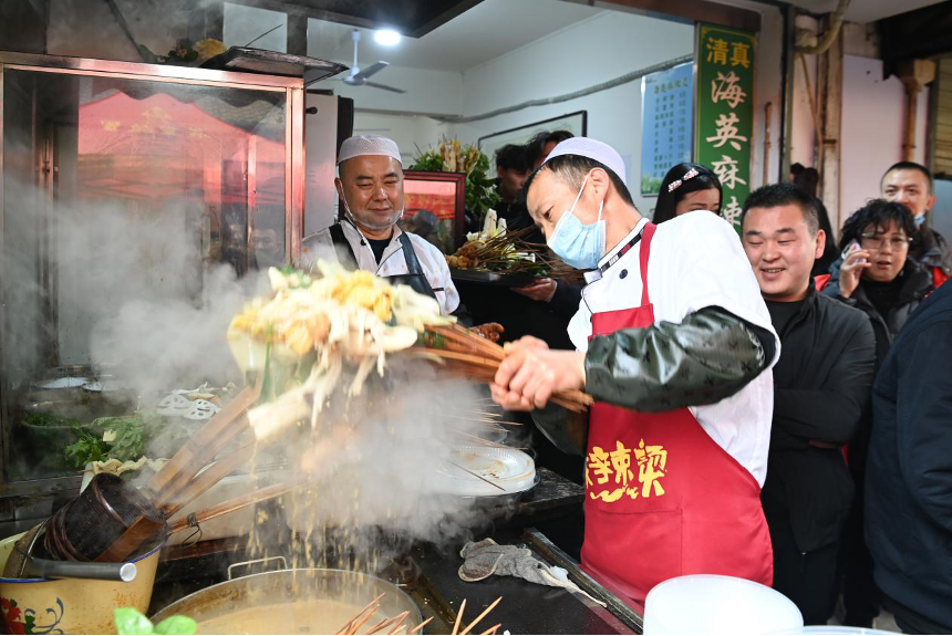 天水市秦州區的天水名優(you) 小吃城一麻辣燙店,商家為(wei) 遊客加工麻辣燙。新華社記者 範培珅 攝