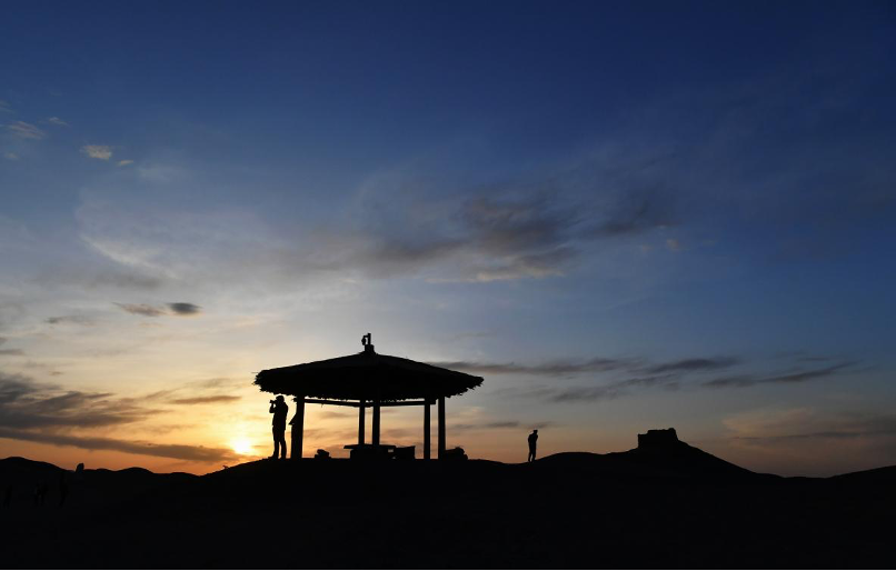 傍晚,遊客在陽關(guan) 拍攝大漠落日景色。新華社記者 陳斌 攝