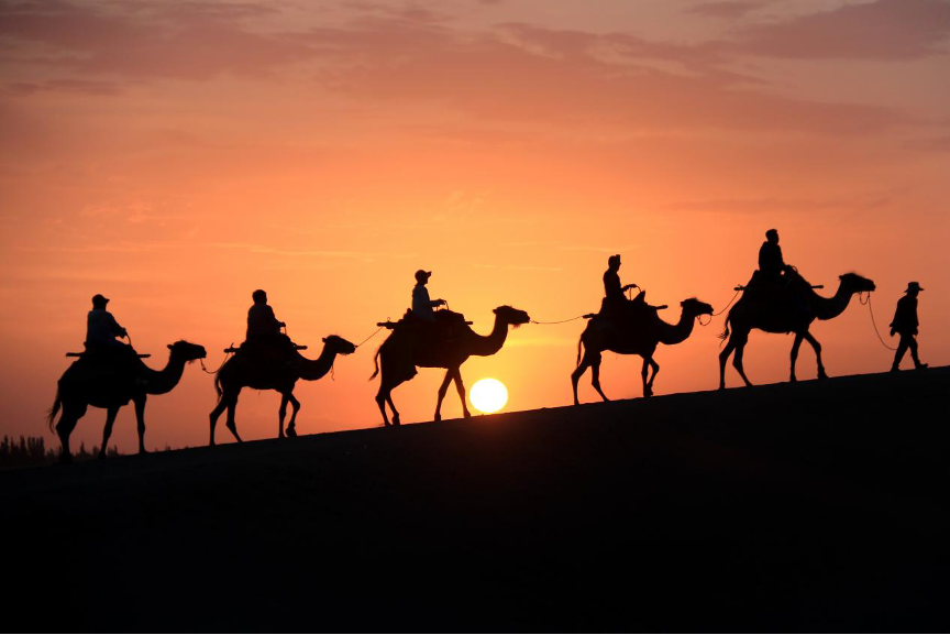 清晨,遊客在甘肅省敦煌市鳴沙山月牙泉景區遊覽。新華社發(張曉亮 攝)
