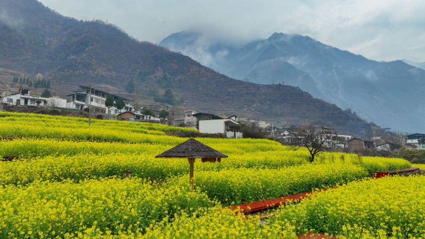 隴南市文縣玉壘鄉(xiang) 的油菜花海(無人機照片)。新華社記者 郎兵兵 攝