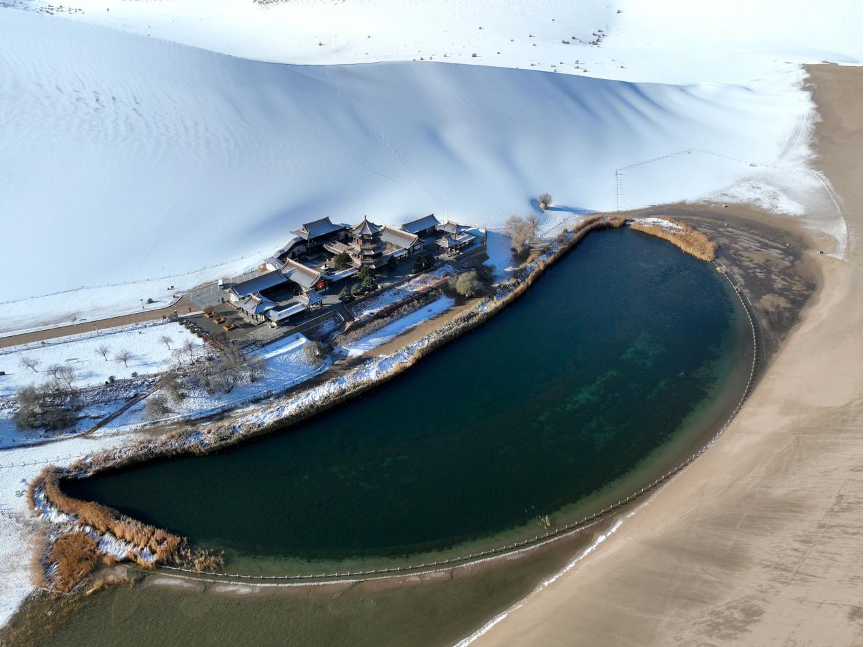 敦煌鳴沙山月牙泉景區雪景(無人機照片)。新華社發(張曉亮 攝)