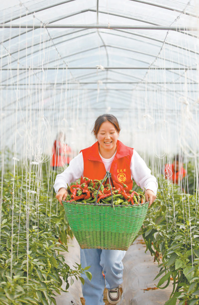 福建省南安市金淘鎮的蔬菜基地內(nei) ,晨光村網格員幫助農(nong) 戶搬運采摘下的辣椒。 謝貴明攝(影像中國)