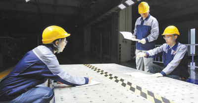 江蘇省蘇州高新區蘇高新股份下屬企業(ye) 世力源總工程師溫晶晶(右一)與(yu) 同事開展設計試驗。 本報記者 王偉(wei) 健攝