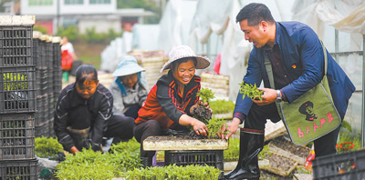 貴州省黔西市雨朵鎮小水井村駐村第一書(shu) 記符蘭(lan) 平(右一)向村民了解生產(chan) 情況。 周訓超攝(人民視覺)