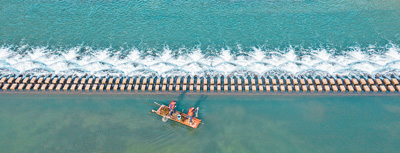湖南省永州市東(dong) 安縣白牙市鎮鐵爐村村幹部(左)與(yu) 誌願者在湘江一級支流紫水河上打撈漂浮物。 蔡小平攝(人民視覺)