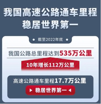 1999年,“黃金周”這個(ge) 概念第一次出現在大眾(zhong) 視野裏,在那一年,全國高速公路通車裏程剛突破1萬(wan) 公裏。截至2022年底,我國公路總裏程達到535萬(wan) 公裏,其中高速公路通車裏程17.7萬(wan) 公裏,穩居世界第一。
