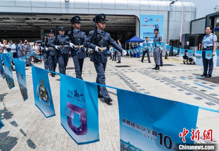 4月13日,香港特區政府保安局下轄的各紀律部隊舉(ju) 行“全民國家安全教育日”開放日活動。圖為(wei) 香港航空青年團成員在政府飛行服務隊開放日活動上展示中式步操。(資料圖片) 中新社記者 侯宇 攝