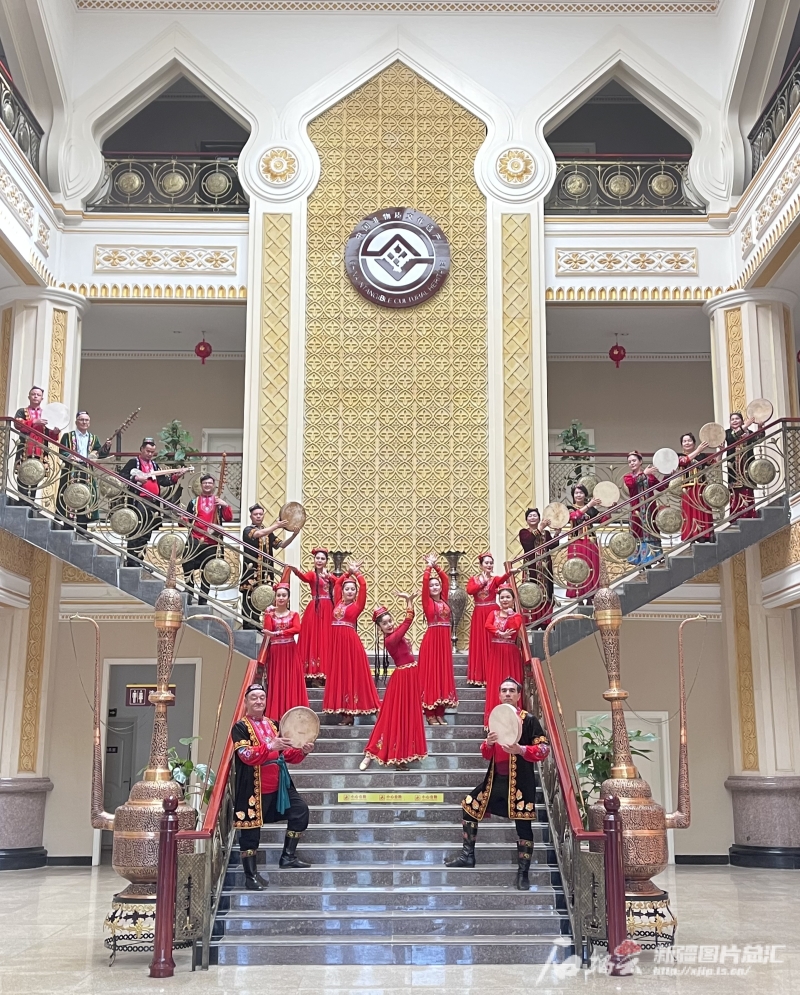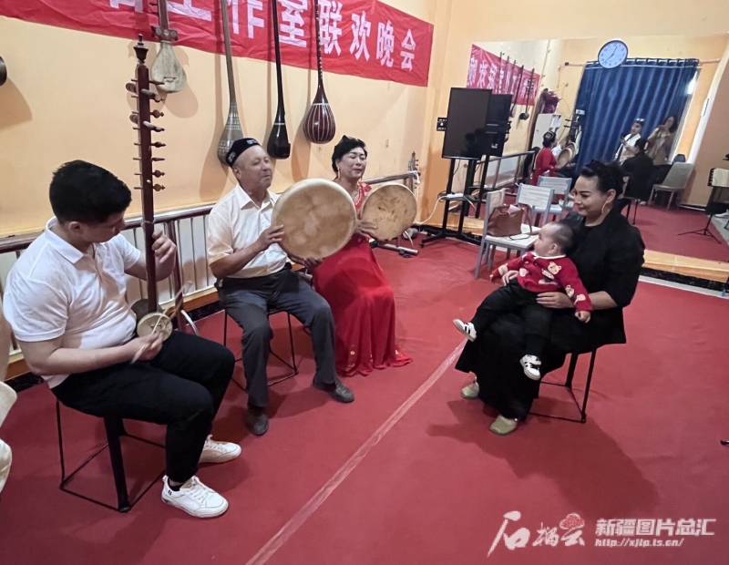 在哈密市非物質文化遺產(chan) 保護中心,回城鄉(xiang) 的傳(chuan) 承人們(men) 和當地演員進行哈密木卡姆表演。石榴雲(yun) /新疆日報記者 王晶晶攝
