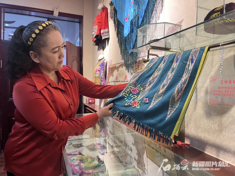 哈密刺繡國家級代表性傳(chuan) 承人阿加汗·賽買(mai) 提家,不僅(jin) 有刺繡工廠,還有一個(ge) 展示哈密刺繡的展廳。石榴雲(yun) /新疆日報記者 王晶晶攝