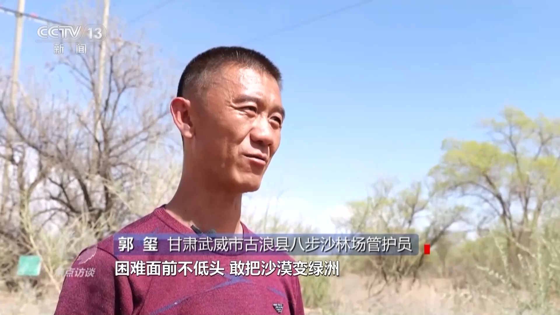 甘肅武威市古浪縣八步沙林場管護員 郭璽:總書(shu) 記跟我說,困難麵前不低頭,敢把沙漠變綠洲。我們(men) 要一代一代傳(chuan) 承下去,我爺爺他們(men) 幾十年種下的樹不能到我們(men) 手裏死掉。