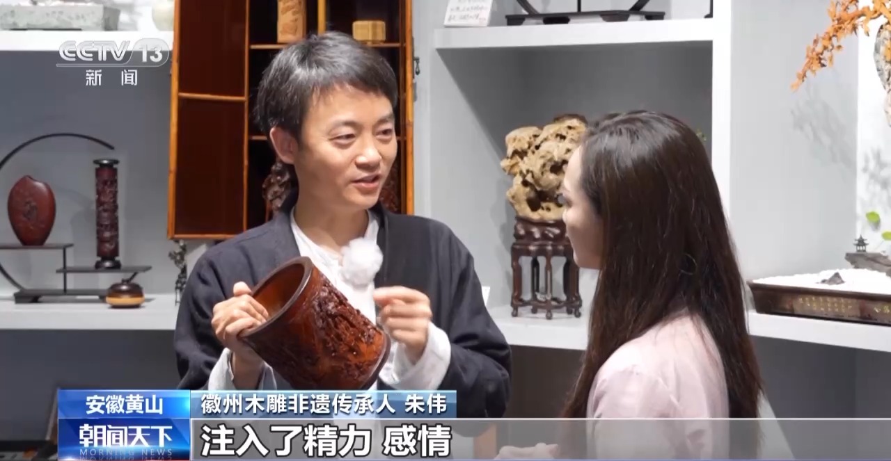 徽州木雕非遺傳(chuan) 承人 朱偉(wei) :一件作品從(cong) 穿短袖刻到穿棉襖,又從(cong) 穿棉襖刻到穿短袖,春夏秋冬,注入了精力、感情,是有生命力的。