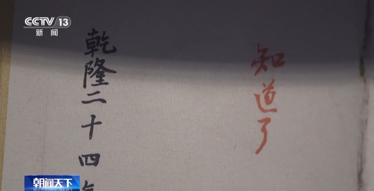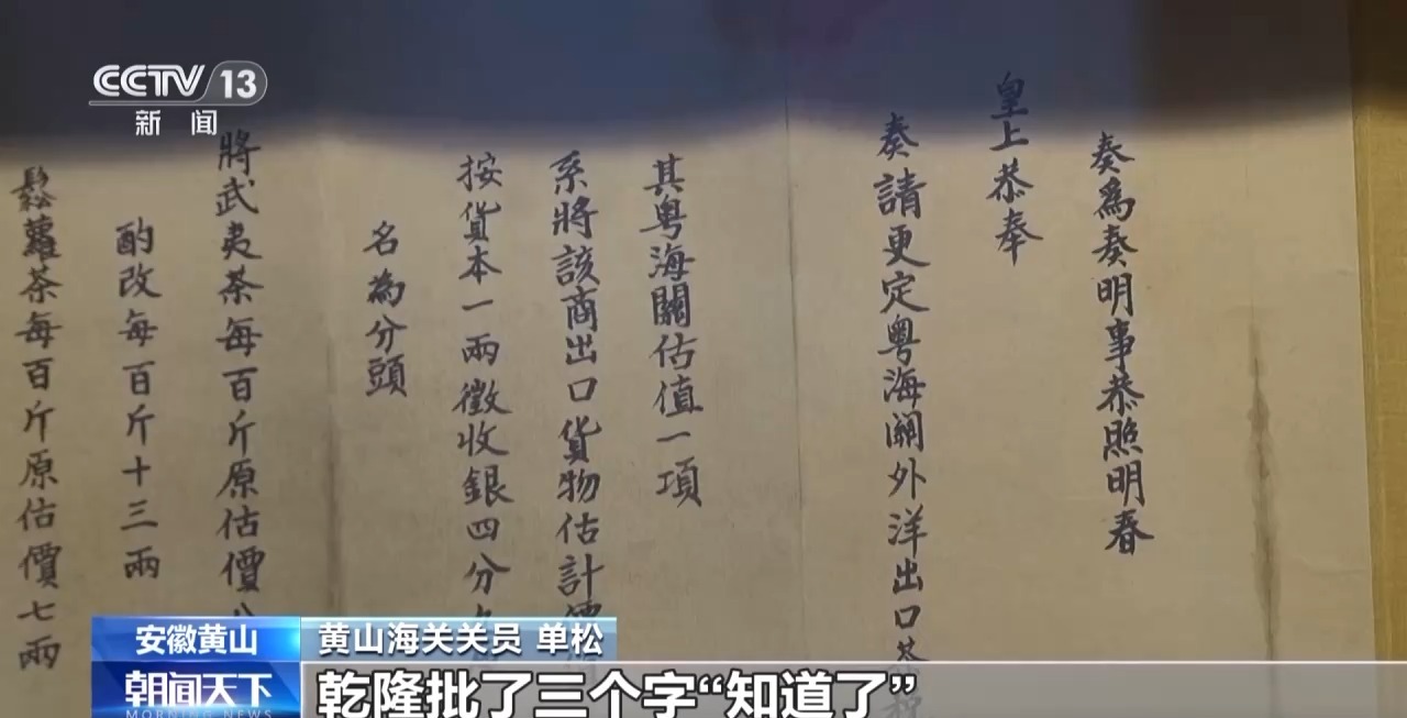 黃山海關(guan) 關(guan) 員 單鬆:這是一份乾隆年間的奏折,它的主要內(nei) 容就是提高出口茶葉的價(jia) 格,距今已經260多年,乾隆批了三個(ge) 字“知道了”,特別有趣。