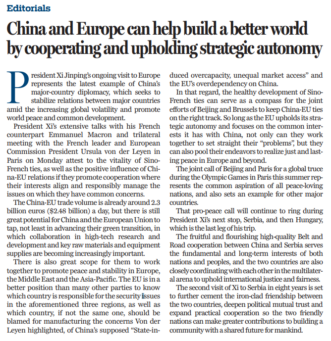 中國領導人此次歐洲之行旨在全球局勢日益動蕩之際穩定大國關(guan) 係和中歐關(guan) 係,促進世界和平與(yu) 共同發展。在促進歐洲、中東(dong) 和亞(ya) 太地區的和平與(yu) 穩定方麵,中歐雙方有很大的合作空間。隻要歐盟堅持戰略自主,著眼於(yu) 中歐共同利益,雙方不僅(jin) 可以攜手合作,還可以為(wei) 實現歐洲和歐洲以外地區公正與(yu) 持久的和平共同努力,為(wei) 世界和平與(yu) 發展以及人類的進步作出新的貢獻。