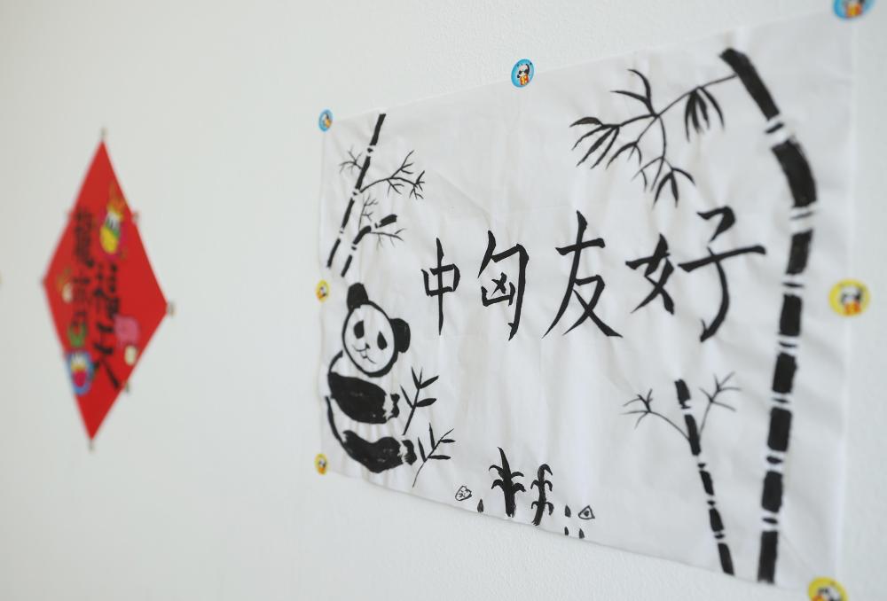 寫(xie) 有“中匈友好”的小朋友畫作貼在匈中雙語學校教室牆上(2024年5月3日攝)。