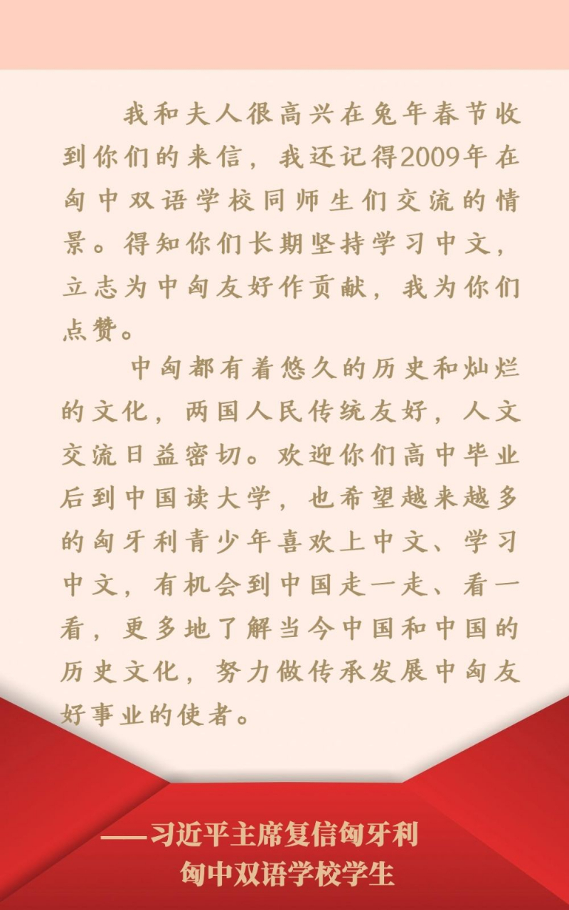 2023年春節前夕,匈中雙語學校學生胡靈月、宋智孝代表全校學生致信習(xi) 近平主席和夫人彭麗(li) 媛教授,按照中國風俗拜年,講述在校學習(xi) 中文12年的感受,表達將來到中國上大學、為(wei) 匈中友好作貢獻的願望。