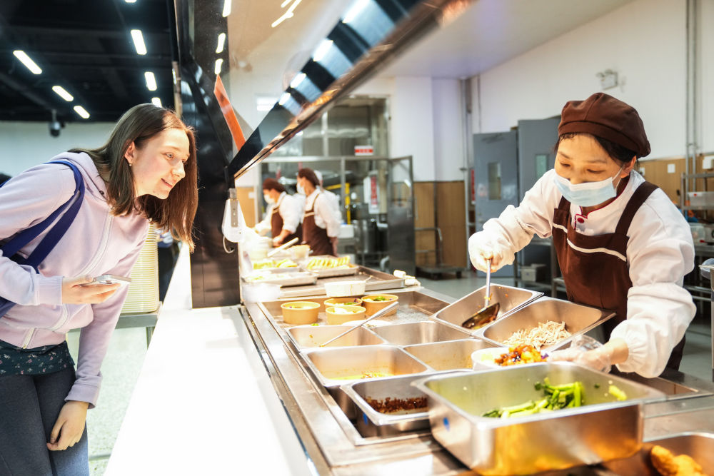 胡靈月在北京首都師範大學的食堂內(nei) 打飯(2024年4月28日攝)。