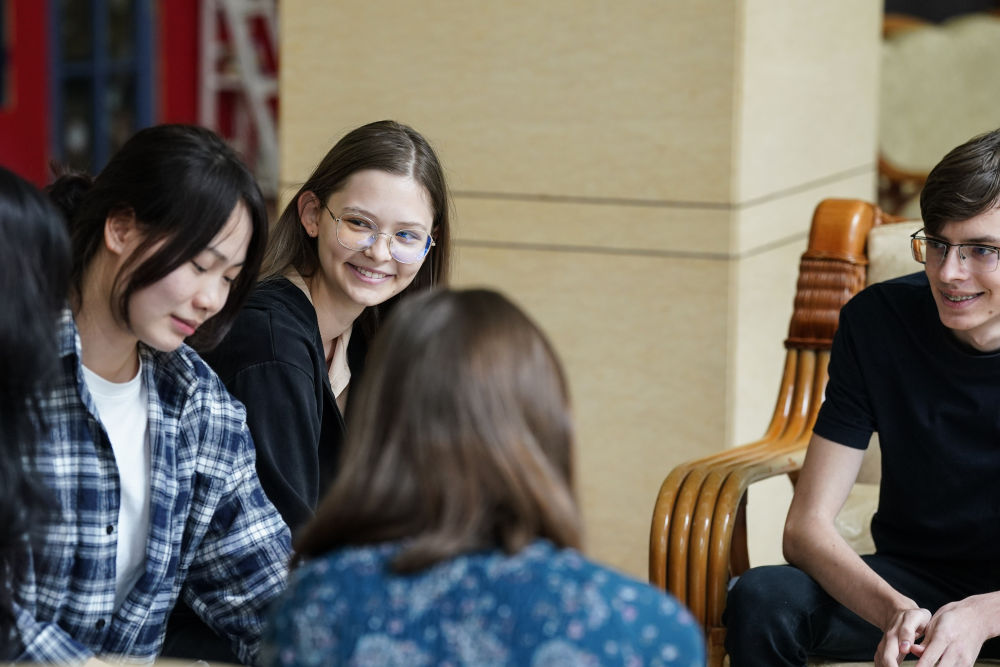 宋智孝(左二)在北京首都師範大學校園內(nei) 與(yu) 同學交流(2024年4月28日攝)。
