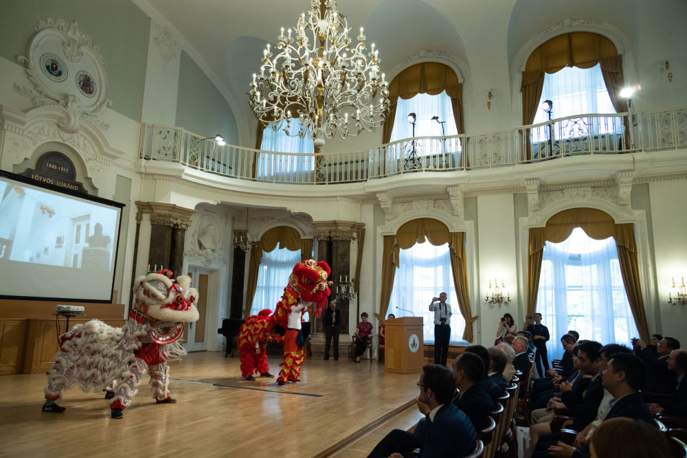 這是2022年6月21日在匈牙利布達佩斯舉(ju) 行的羅蘭(lan) 大學孔子學院成立15周年慶典上拍攝的舞獅表演。目前,匈牙利已開設5所孔子學院。