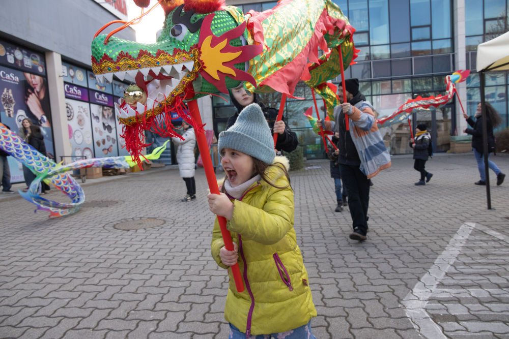 2024年2月3日,一名女孩在匈牙利布達佩斯唐人街的新春廟會(hui) 上體(ti) 驗舞龍。