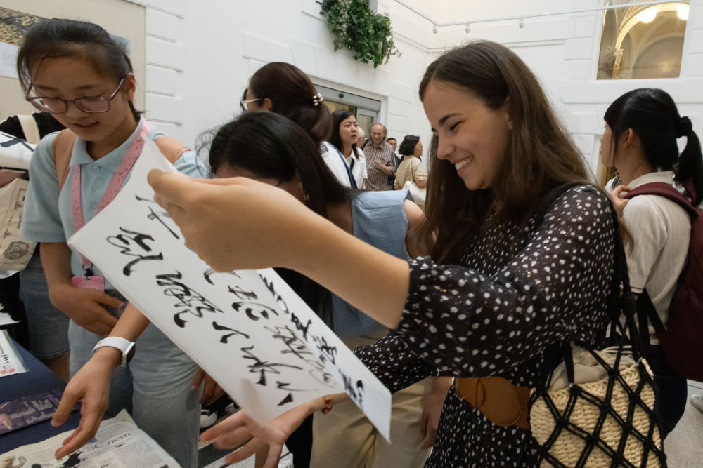 2023年8月29日,嘉賓在匈牙利布達佩斯“美美與(yu) 共——中國匈牙利詩歌吟誦會(hui) ”暨“漢字與(yu) 中華文明”展上體(ti) 驗中國書(shu) 法。
