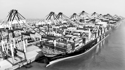 貨輪在山東(dong) 青島港裝卸集裝箱。新華社發