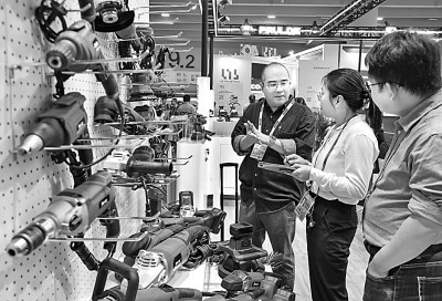 印尼零售企業(ye) 在廣交會(hui) 五金工具展區了解中國企業(ye) 的展品。新華社發