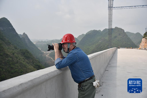 法國攝影師格雷瓜爾·戴高樂(le) 在花江峽穀大橋施工現場拍攝(4月27日攝)。新華社記者 駱飛 攝
