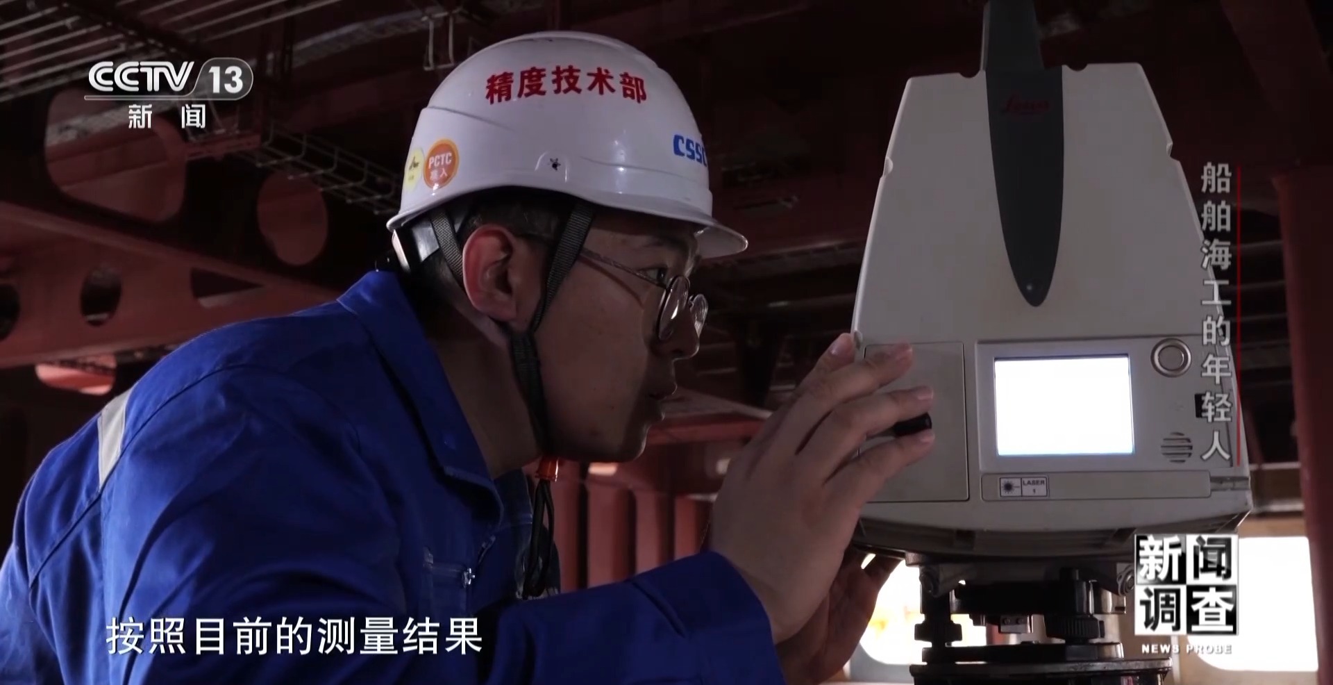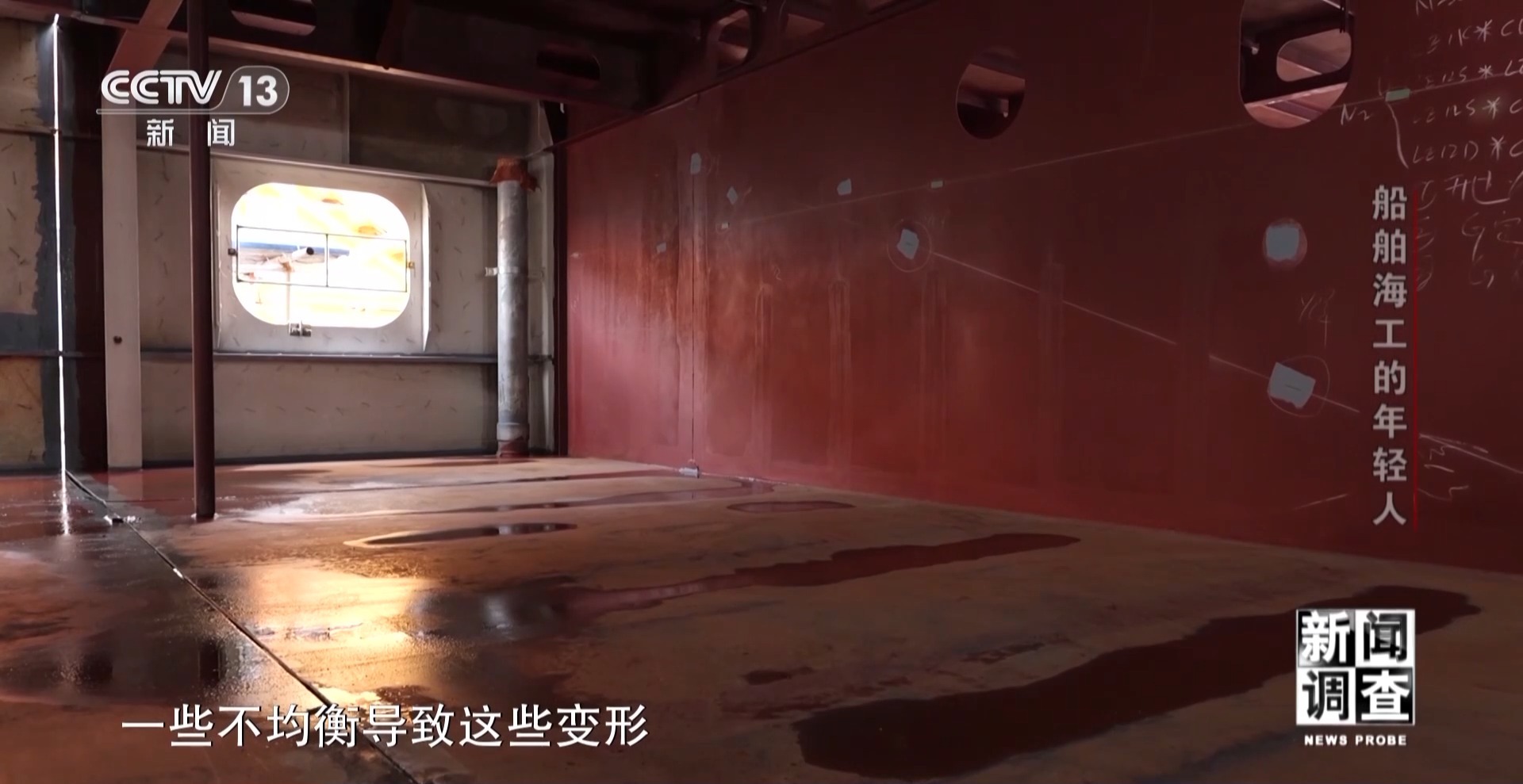 上海外高橋造船有限公司精度技術部副部長 孫建誌:這個(ge) 總段是典型的薄板結構,不平程度在正負15毫米之內(nei) 。所有的變形都是熱的影響,熱輸入以後就會(hui) 產(chan) 生殘餘(yu) 應力,一些不均衡導致這些變形。尤其是薄板結構更明顯,現在2號船的整體(ti) 的平整度應該相對1號船已經好很多了。