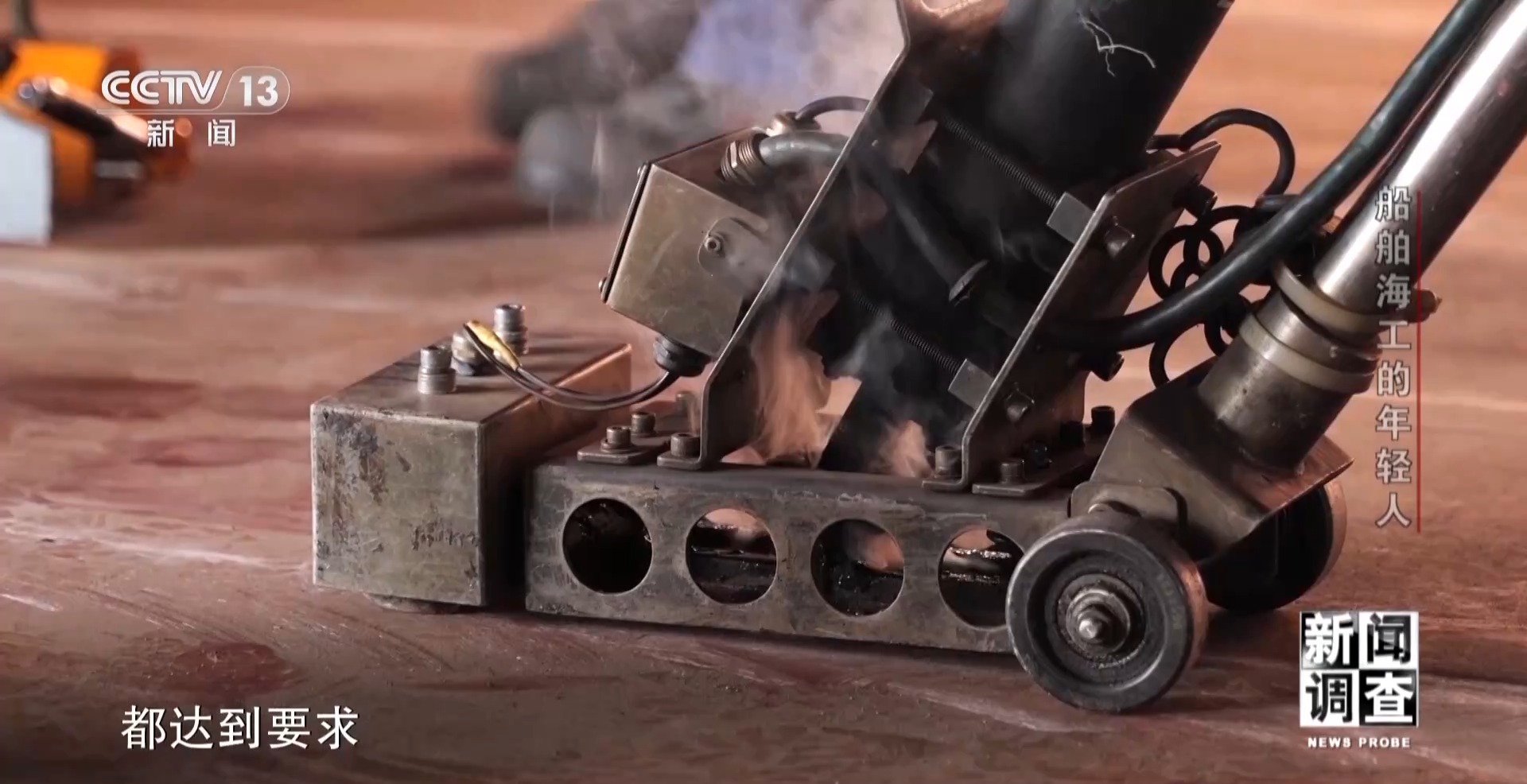 江蘇大洋海洋裝備有限公司技能大師工作室主任 孫玉龍:這個(ge) 板子比較特殊,它是EH690鋼,硬度比較高,板厚也比較厚。想把它焊合格是很難的,兩(liang) 個(ge) 人要焊一天。焊不好它會(hui) 產(chan) 生內(nei) 部缺陷,比如說氣孔、裂紋等一係列的缺陷在裏麵。
