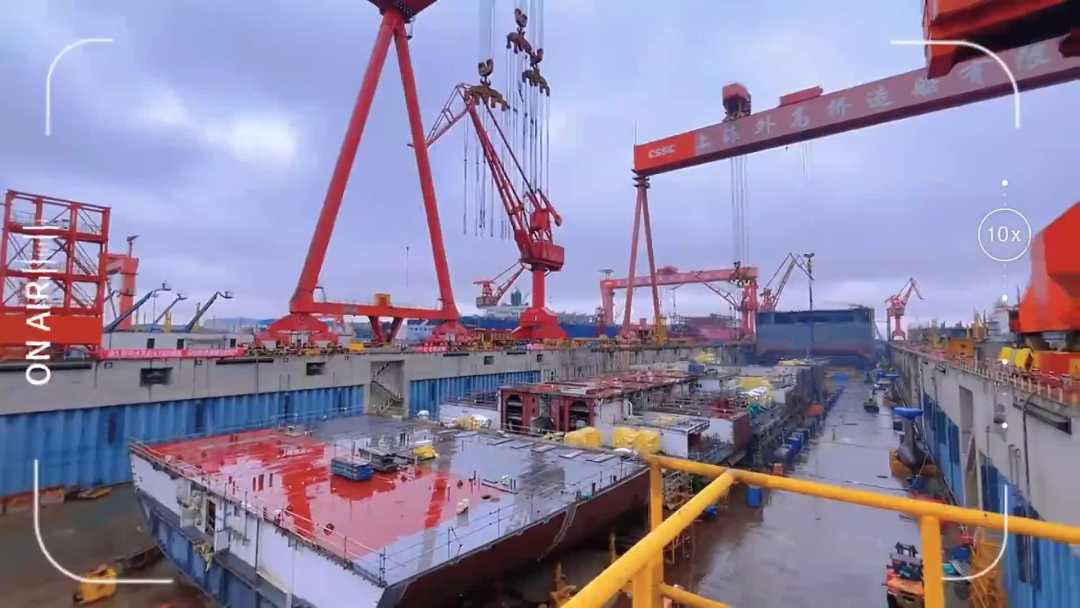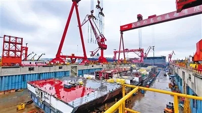 兩(liang) 台龍門吊緩緩起降,有序吊裝船體(ti) 部件——中國船舶集團上海外高橋造船2號船塢,第二艘國產(chan) 大型郵輪不久前在這裏迎來下塢搭載總裝節點。