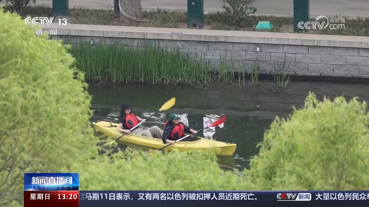 在北京朝陽區亮馬河畔水清岸綠,垂釣、散步、劃槳板的遊人絡繹不絕,享受假日時光。