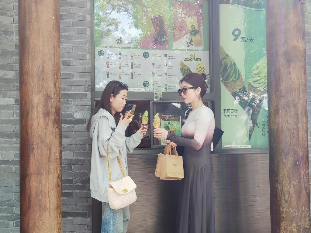 5月8日,位於(yu) 東(dong) 四大街的吳裕泰茶莊門口,兩(liang) 名女士在購買(mai) 冰激淩。新華社記者謝希瑤 攝