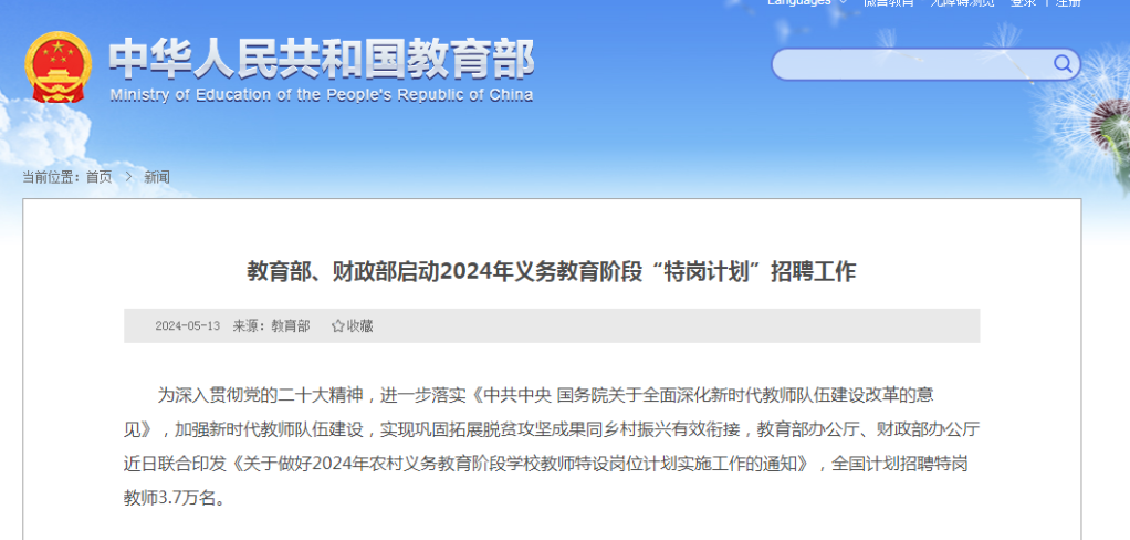 記者5月13日從(cong) 教育部獲悉,教育部辦公廳、財政部辦公廳近日聯合印發通知,就做好2024年農(nong) 村義(yi) 務教育階段學校教師特設崗位計劃實施工作進行部署。根據通知,2024年全國計劃招聘“特崗計劃”教師37000名。