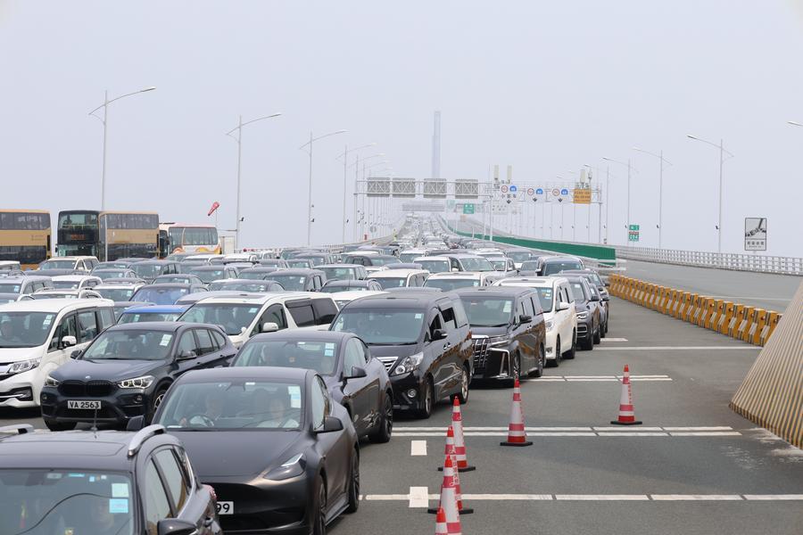 2024年3月9日拍攝的港珠澳大橋橋頭等待北上的車輛。港珠澳大橋邊檢站的數據顯示,截至3月9日21時,經該站查驗的出入境“港車北上”車輛已突破50萬(wan) 輛次。邊檢部門介紹,自2023年7月1日“港車北上”政策正式實施以來,駕駛單牌私家車“北上”的香港居民數量持續上升。 新華社發(王相國攝)