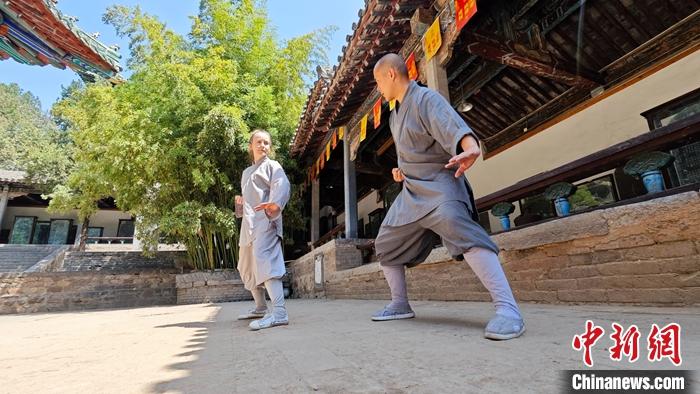 5月16日,河南登封少林寺內(nei) 武僧釋延燁(右)傳(chuan) 授弗謝米爾諾娃·斯韋特蘭(lan) 娜(左)少林功夫。 中新社記者 李超慶 攝